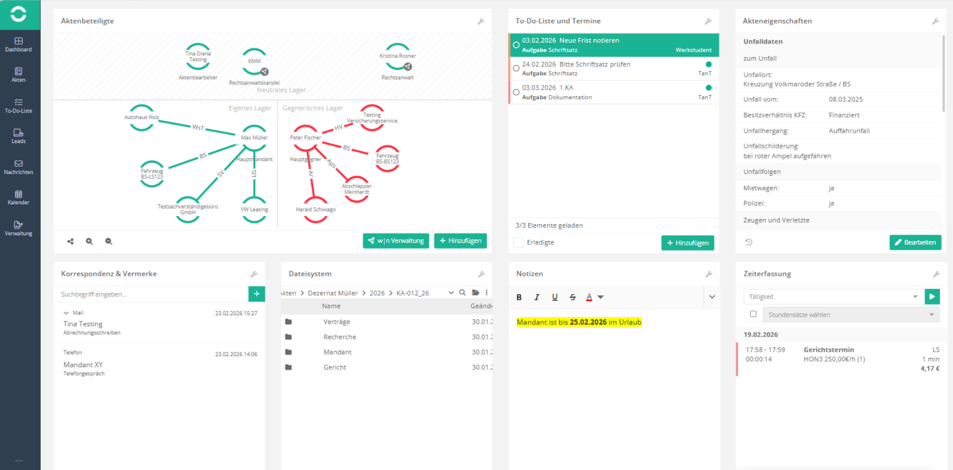 Die Aktenansicht bündelt Beteiligte, Fristen, Korrespondenz, Dateien und Zeiterfassung in einem Dashboard.