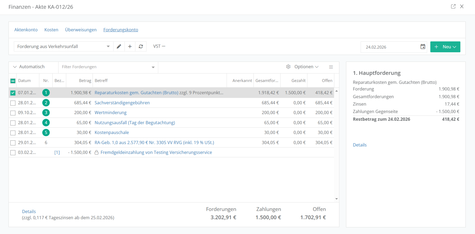 Forderungsverwaltung direkt in der Akte – mit automatischer Zinsberechnung und Zahlungszuordnung.