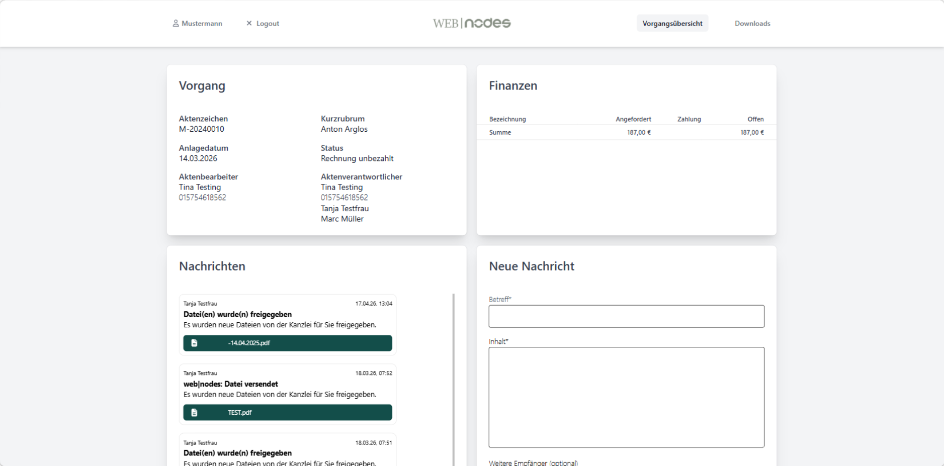 Das Mandantenportal gibt Mandanten Einblick in Vorgangsstand, Finanzen und Kanzleinachrichten.