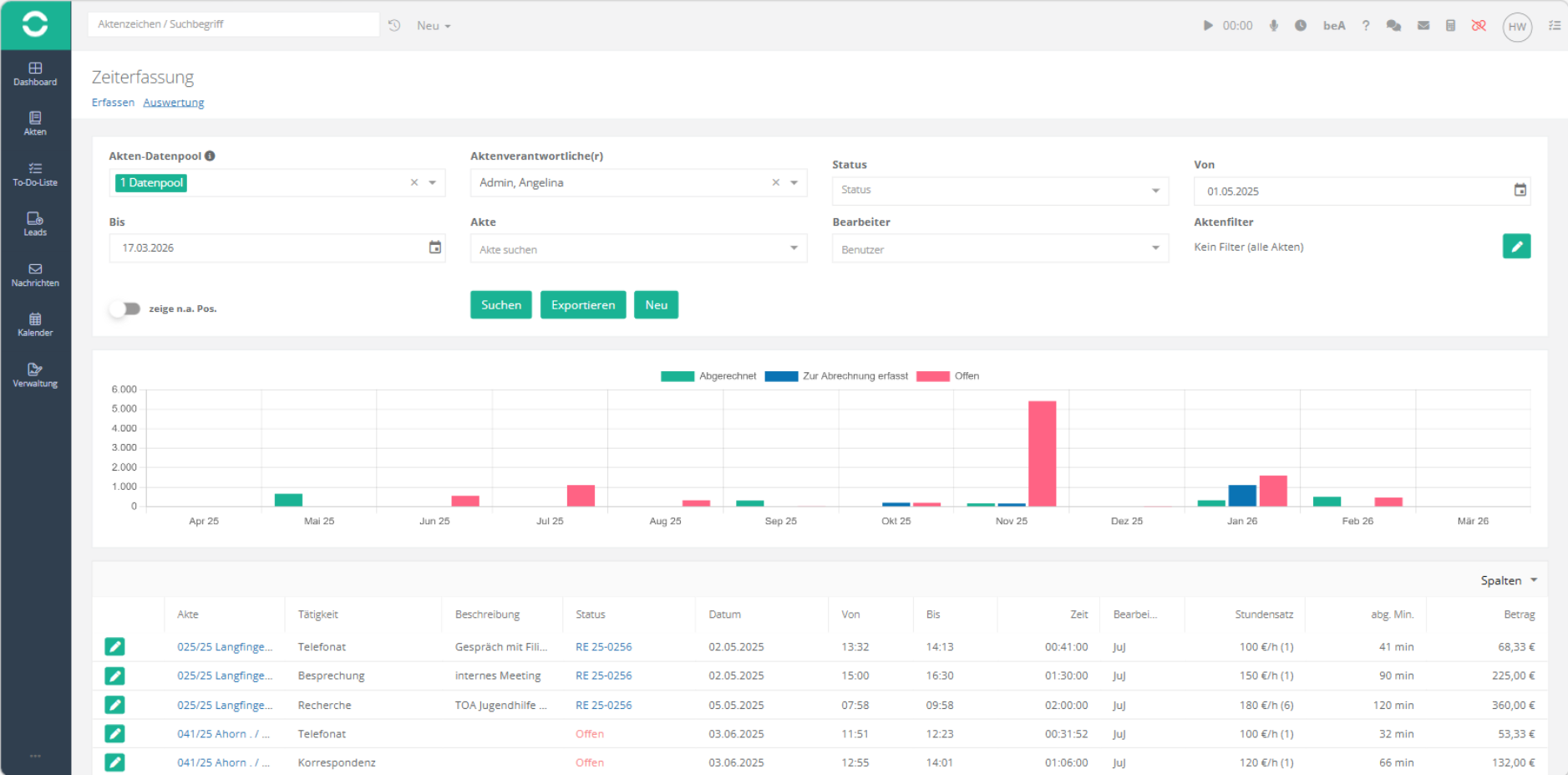 Zusätzlich dazu können Zeiten auf Akten gebucht und abgerechnet werden.